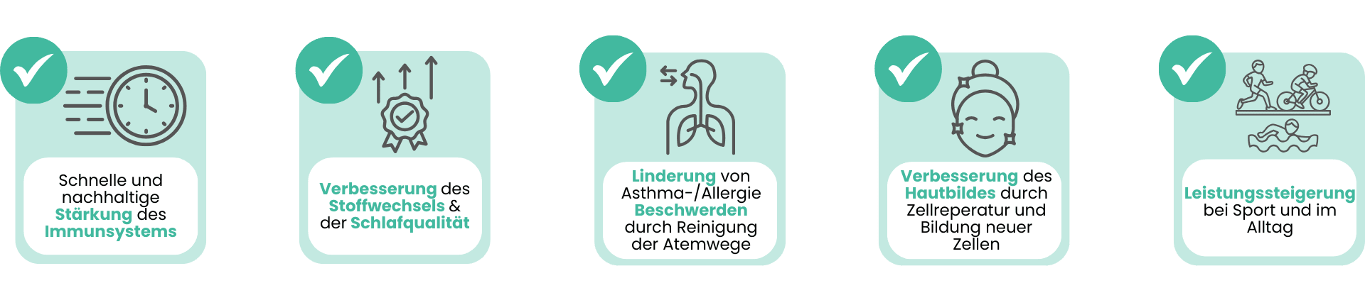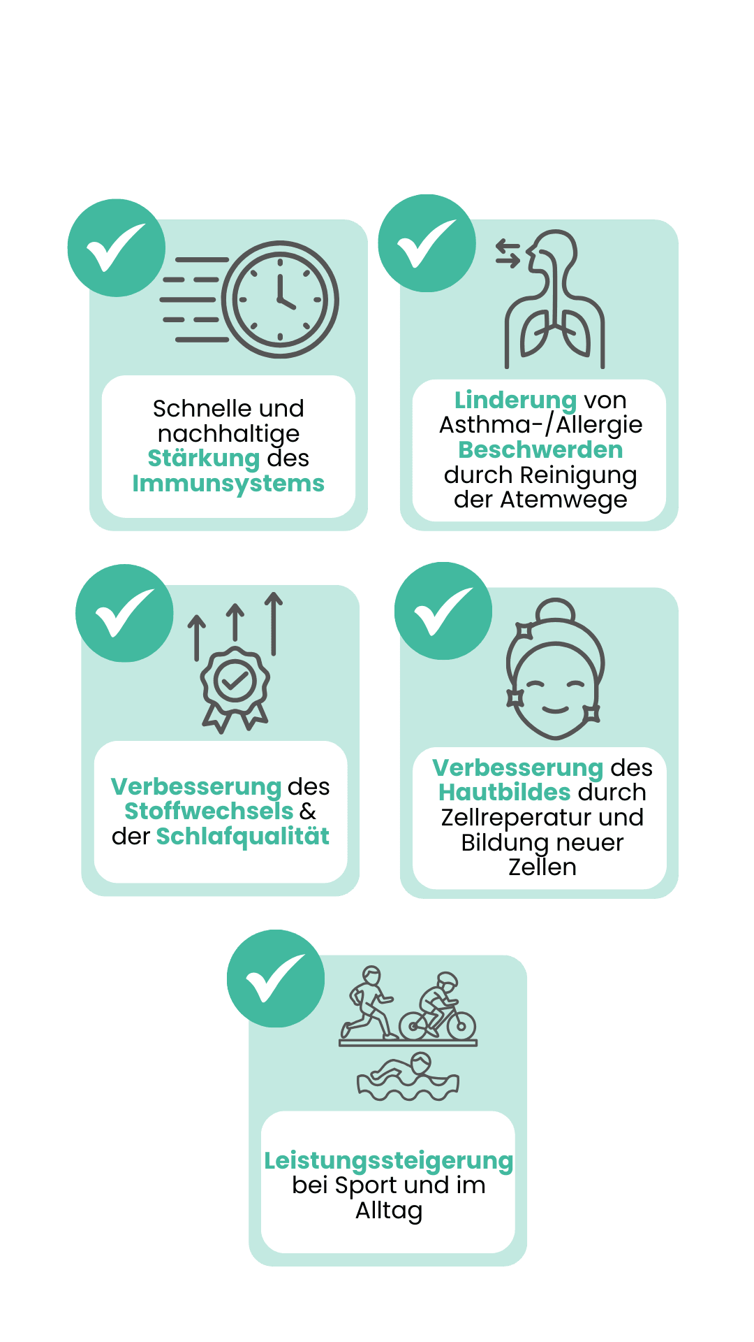 Während der Behandlung werden bioverfügbarer Sauerstoff, Vitalstoffe, Antioxidantien und Biofotone in der Kabine freigesetzt und über Deine Haut und Atemwege aufgenommen.